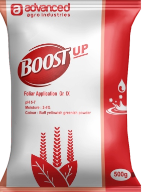 Boost Up is hydrolyzed protein based formulation containing unique combination of organic Nitrogen derived from veg. / animal origin protein (Casein/Gelatin) in the form of amino acids with Phosphorus, Potassium, Calcium, essential minerals and trace elements, vitamins and other organic bio activators green seaweed extract, cytokinin, etc.